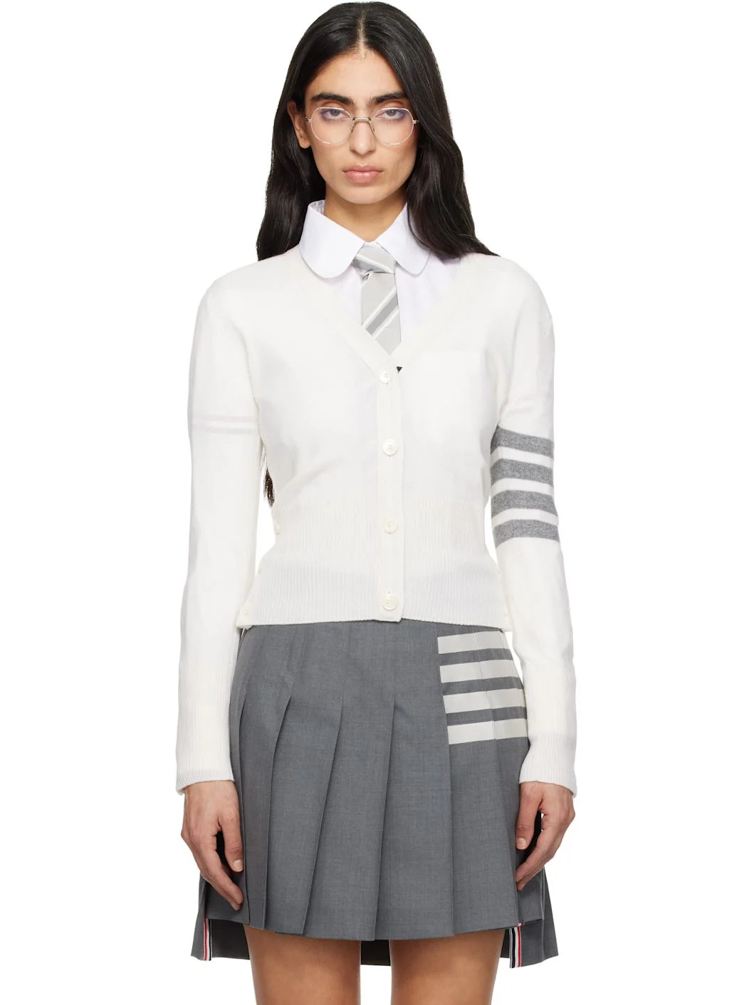 White Cotton Crepe V-Neck 4-Bar Cardigan