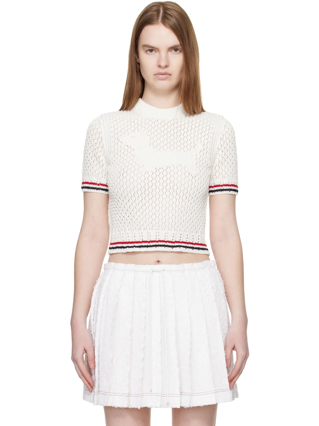 Cotton pointelle sweater. · Rib-knit crewneck, hem, and cuffs · Intarsia graphic at chest · Stripes at hema nd cuffs · Tricolor flag at back collar Supplier color: White 100% cotton. Made in Ireland 261381F096000