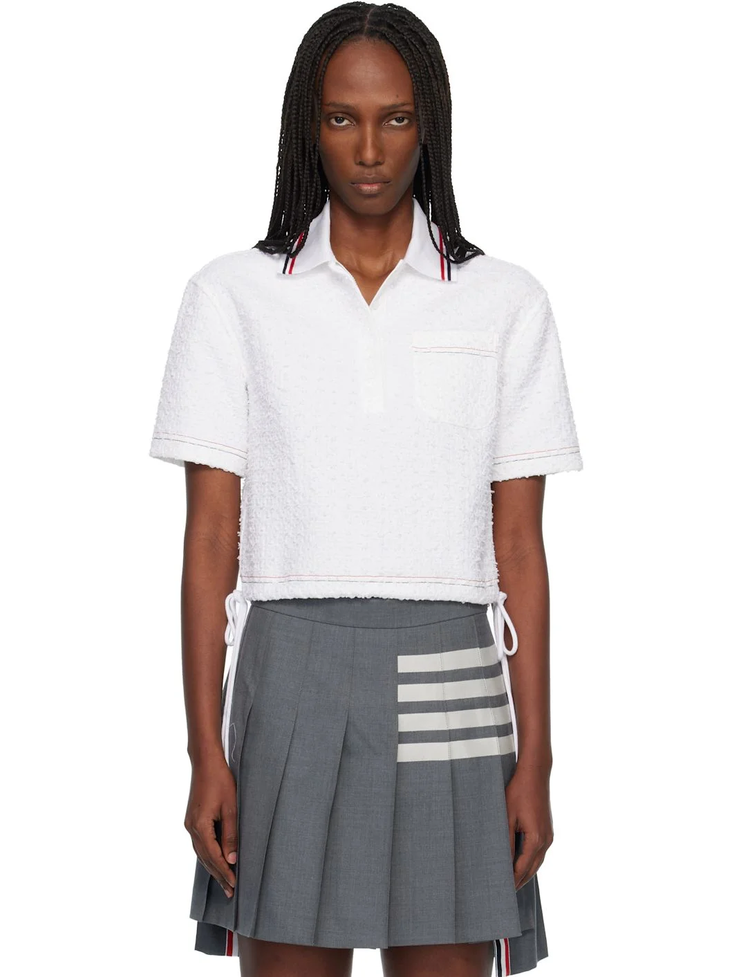 Cotton-blend tweed polo. · Stripes at rib-knit spread collar · Concealed four-button placket · Patch pocket at chest · Embroidered stripes at pocket, hem, and cuffs · Drawstring at cropped hem · Tricolor grosgrain flag at back collar Supplier color: White Body: 82% cotton, 18% polyamide. Trim 1: 97% cotton, 3% elastane. Trim 2: 65% polyester, 35% cotton. Made in Italy 261381F108004