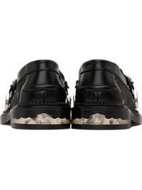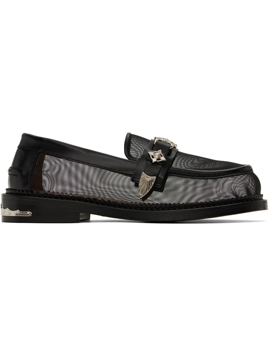 Sheer mesh and buffed leather loafers in black. · Moc toe · Strap with graphic hardware at vamp · Pinched seam at heel counter · Serrated edge at welt · Plaque at heel · Stacked leather heel with rubber injection · Leather sole Supplier color: Black Upper: textile, leather. Sole: leather, rubber. Made in Portugal 251492F121014