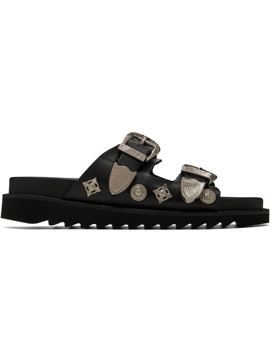 Buffed leather flat sandals in black. · Graphic hardware throughout · Open toe · Pin-buckle straps at vamp · Logo stamp at molded leather footbed · Buffed leather lining · Treaded foam rubber platform sole · Engraved silver-tone hardware · Platform: H1.5" Supplier color: Black Upper: leather. Sole: rubber. Made in Portugal 251609F124002