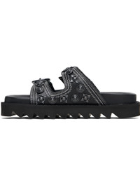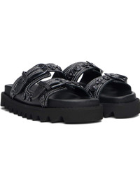 Buffed leather flats sandals. · Graphic hardware throughout · Open toe · Pin-buckle straps at vamp · Logo stamp at molded footbed · Treaded rubber sole · Contrast stitching in white Supplier color: Black Upper: leather. Sole: rubber. Made in Portugal 252492F124000