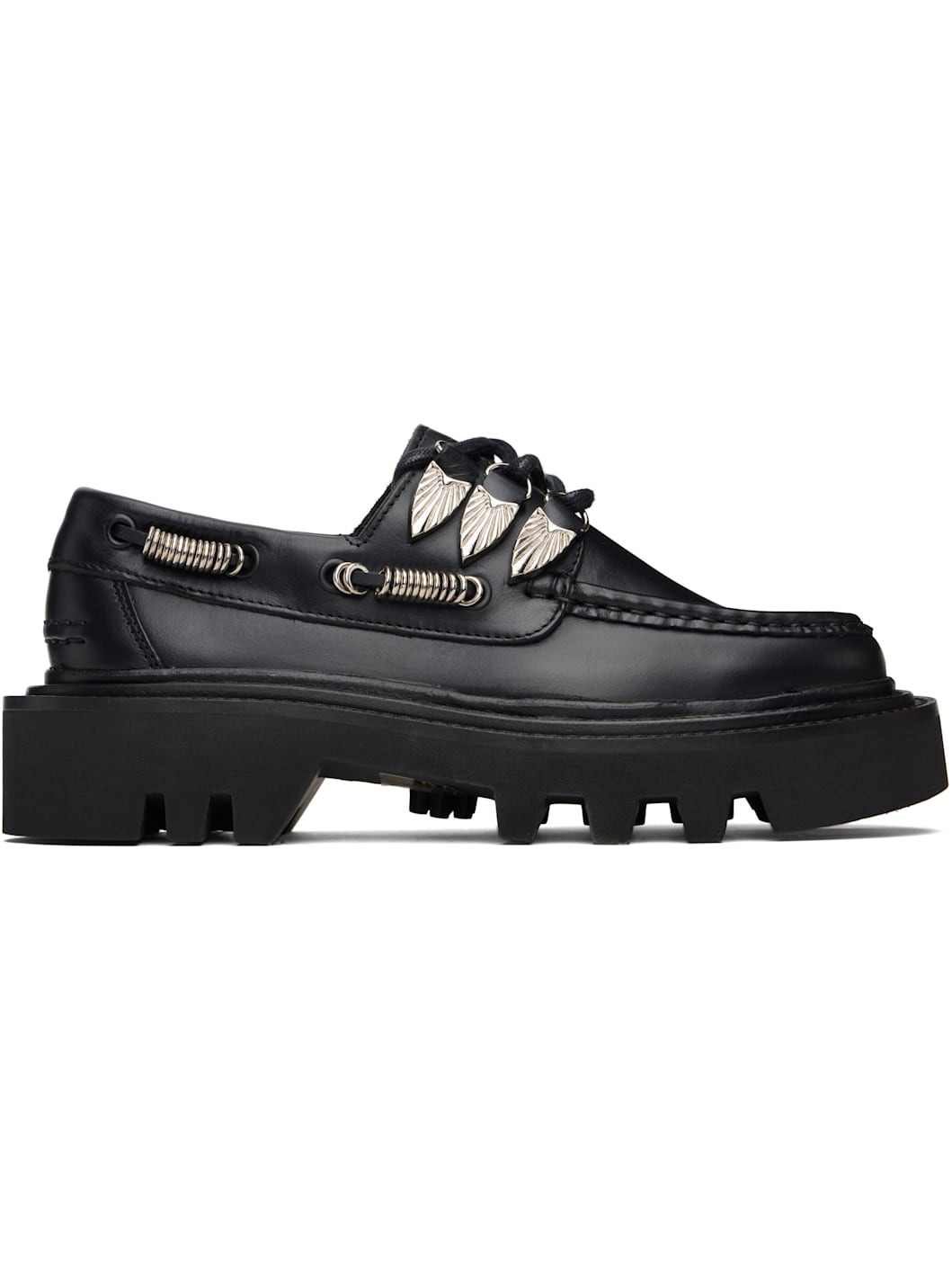 Buffed leather boat shoes. · Moc toe · Graphic hardware at lace-up closure · Cord with O-rings at sides · Pinched seam at heel counter · Topstitching at welt · Foam rubber midsole · Treaded rubber sole Supplier color: Black Upper: leather. Sole: rubber. Made in Portugal 252492F120000