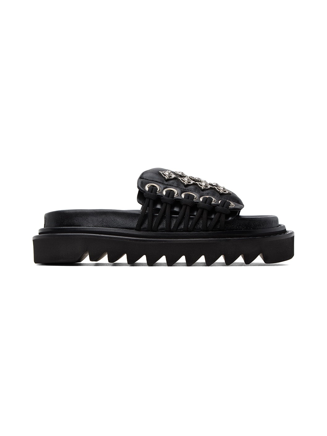 Buffed leather slip-on sandals in black. Graphic hardware and lace-up detailing at padded vamp. · Open round toe · Logo stamp at molded footbed · Grained leather lining · Treaded foam rubber sole Supplier color: Black Upper: leather. Sole: rubber. Made in Portugal 231492F124020