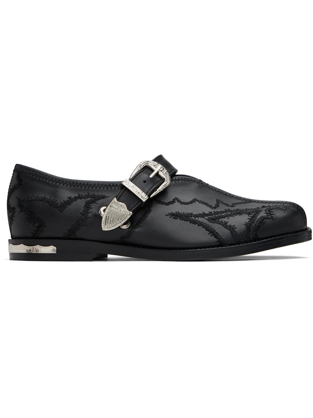 Buffed leather loafers in black. · Embroidered detailing throughout · Square toe · Pin-buckle strap at vamp · Buffed leather and suede lining · Plaque at stacked leather heel · Polished leather sole · Engraved silver-tone hardware Supplier color: Black Leather. Made in Portugal 251492F121000