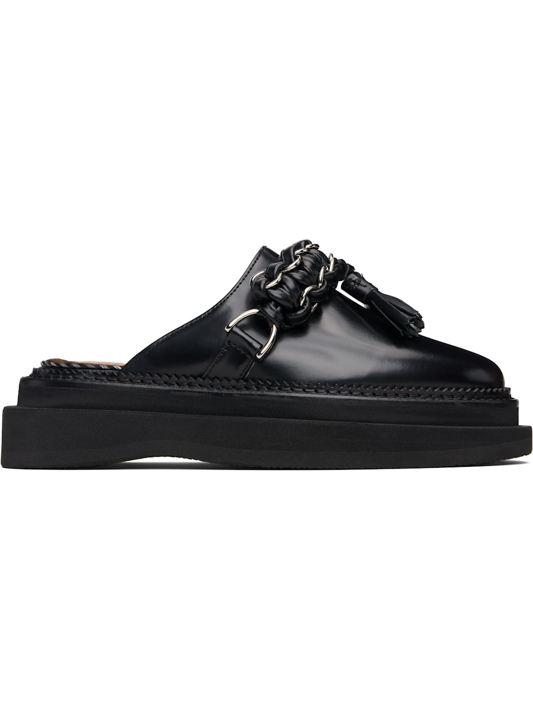 Buffed leather slip-on loafers. · Braided strap with O-rings and tassels at vamp · Serrated edge and topstitching at welt · Foam rubber midsole · Treaded rubber sole Supplier color: Black Upper: leather. Sole: rubber. Made in Portugal 252492F121005