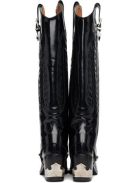 Knee-high buffed leather boots. · Pointed toe · Elasticized harness with hardware at vamp · Pull-loop and pin-buckle strap at collar · Engraved plaque at heel · Stacked leather heel with rubber injection · Leather sole · Heel: H2.5" Supplier color: Black Upper: leather. Sole: leather, rubber. Made in Portugal 252492F115000