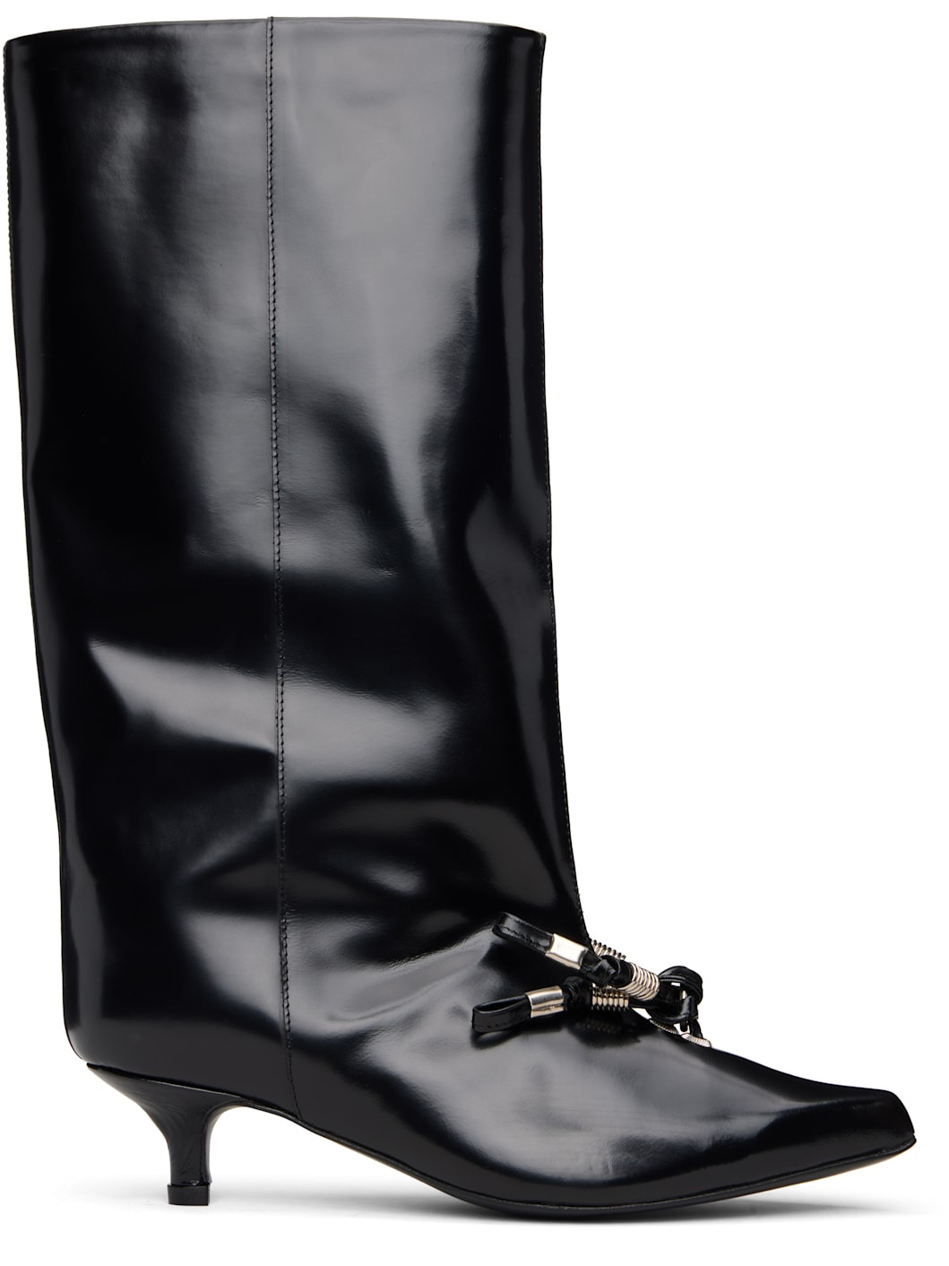 Knee-high polished leather boots. · Pointed toe · Knotted straps with O-rings at vamp · Buffed leather lining · Covered kitten heel with rubber injection · Leather sole · Heel: H1.5" Supplier color: Black Upper: leather. Sole: leather, rubber. Made in Portugal 252492F115003