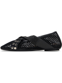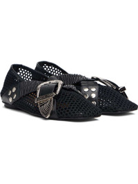 Sheer mesh and buffed leather ballerina flats. · Square toe · Ruched crisscrossing pin-buckle strap at vamp · Graphic hardware and rivets at vamp · Leather sole with rubber injection Supplier color: Black Upper: textile, leather. Sole: leather, rubber. Made in Portugal 252492F118006