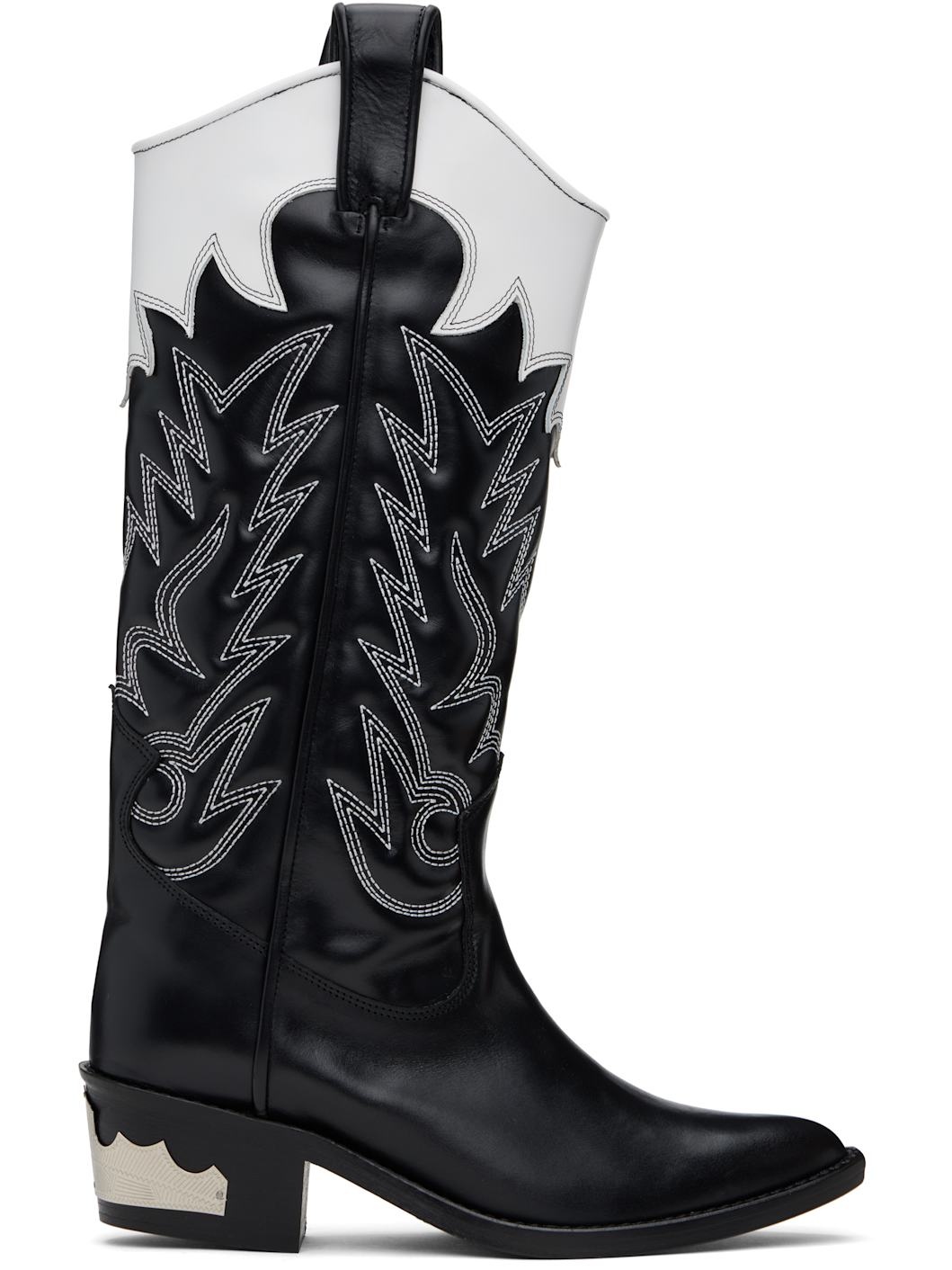 Knee-high buffed leather boots in black and white. · Embroidered detailing throughout · Pointed toe · Pull-loops at collar · Graphic hardware at heel · Stacked leather heel with rubber injection · Leather sole · Contrast stitching in white · Heel: H2" Supplier color: White/Black Upper: leather. Sole: leather, rubber. Made in Portugal 251492F115001