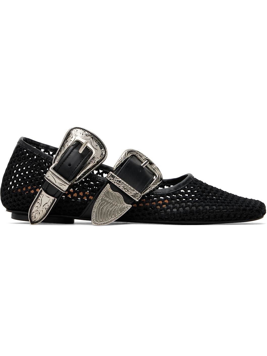 Sheer crocheted mesh ballerina flats in black. · Buffed leather trim throughout · Square toe · Pin-buckle straps at vamp · Leather sole with rubber injection · Engraved silver-tone hardware Available exclusively at SSENSE. Supplier color: Black Upper: textile, leather. Sole: leather, rubber. Made in Portugal 251492F118012