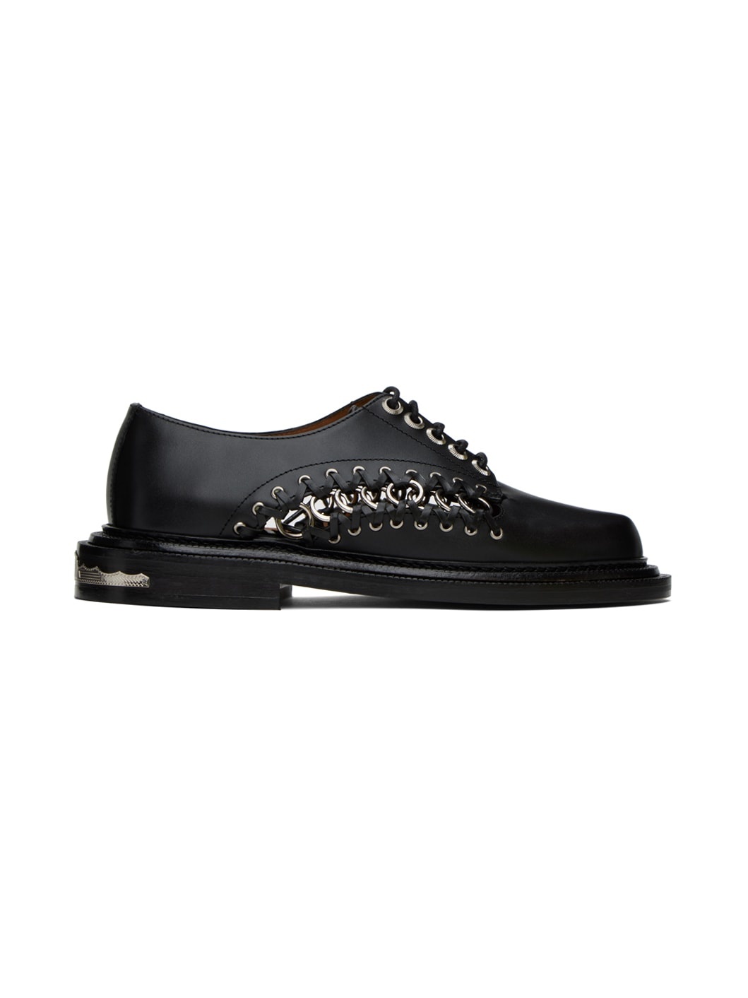 Buffed leather derbys in black. · Cutouts, O-ring hardware, and lace-up detailing throughout · Lace-up closure · Buffed leather and suede lining · Serrated edge at welt · Leather heel with rubber injection · Graphic hardware at heel · Leather sole · Heel: 1.25" Available exclusively at SSENSE. Supplier color: Black Upper: leather. Sole: leather, rubber. Made in Portugal 241492F120005