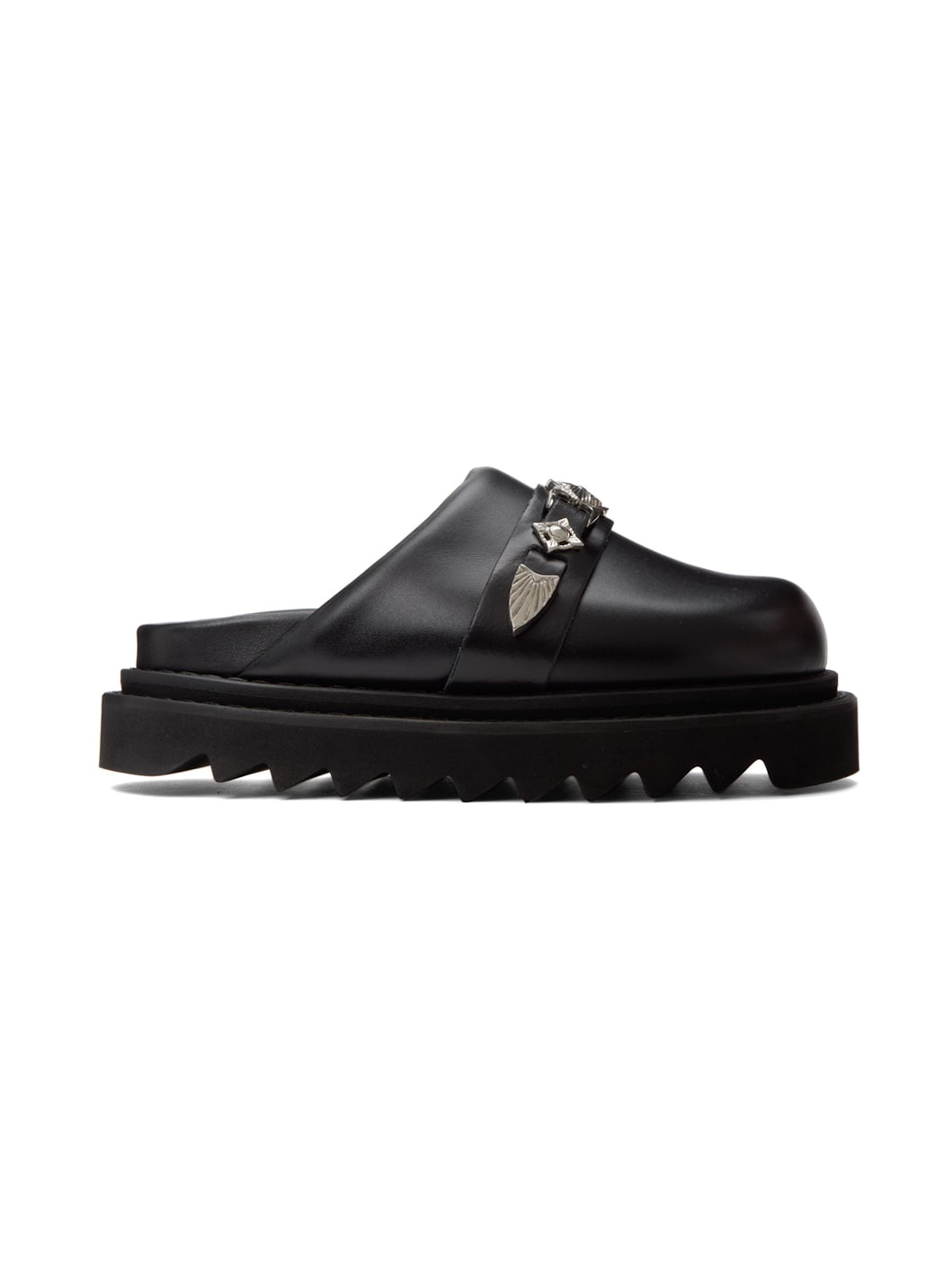 Buffed leather slip-on loafers in black. Signature silver-tone hardware at vamp. · Strap at padded vamp · Logo printed at molded leather footbed · Treaded foam rubber platform sole · Platform: H1 in Available exclusively at SSENSE. Supplier color: Black