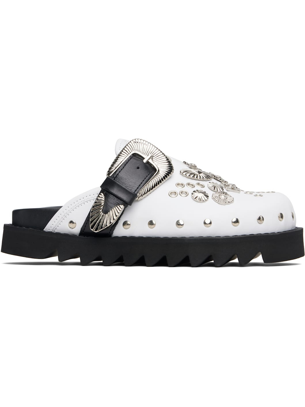 Buffed leather slip-on loafers. · Pin-buckle strap, grommets, and graphic hardware at vamp · Rivets at welt · Logo stamp at molded footbed · Treaded foam rubber sole · Platform: H1.5" Available exclusively at SSENSE. Supplier color: White/Black Upper: leather. Sole: rubber. Made in Portugal 252492F121015