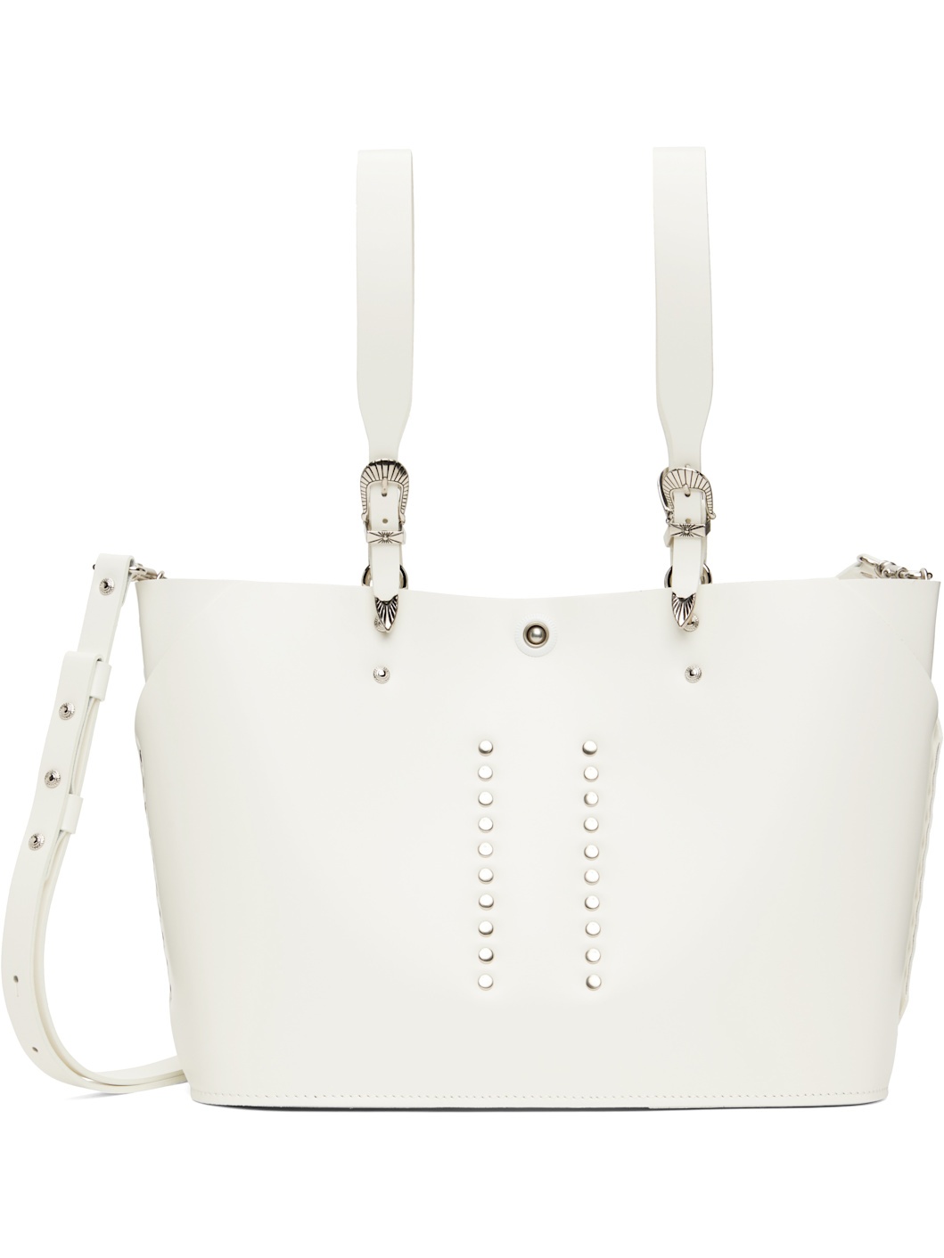 Polished leather tote bag in white. · Studs throughout · Pin-buckle hardware at twin carry handles · Adjustable and detachable shoulder strap · Post-stud closure · Buffed faux-leather lining · Engraved silver-tone hardware · H7.5" x W10" x D4.25" Supplier color: White Leather. Made in Japan 251492F049001