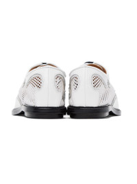 Semi-sheer paneled mesh and buffed leather oxfords in white. · Pointed toe · Lace-up closure · Logo stamp at padded leather footbed · Unlined · Leather sole with rubber injection Supplier color: White Upper: textile, leather. Sole: leather, rubber. Made in Portugal 231492F120002