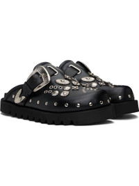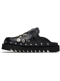 Buffed leather slip-on loafers in black. · Eyelets, studs, and signature graphic hardware throughout · Pin-buckle strap at vamp · Padded tongue · Logo printed at molded leather footbed · Mesh lining · Treaded rubber sole · Silver-tone hardware Supplier color: Black Upper: leather. Sole: rubber. Made in Portugal 251688M231014