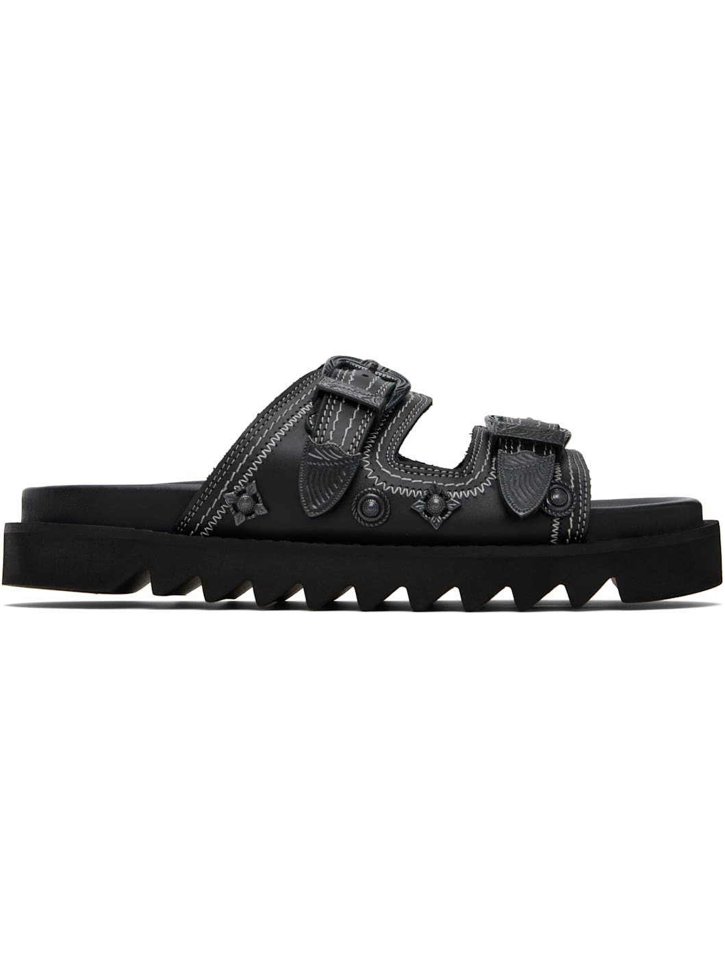 Buffed leather sandals. · Graphic hardware throughout · Open toe · Pin-buckle straps at vamp · Logo stamp at molded footbed · Foam rubber midsole · Treaded rubber sole · Contrast stitching in white Supplier color: Black Upper: leather. Sole: rubber. Made in Portugal 252688M234006