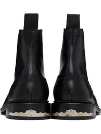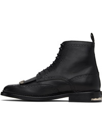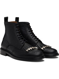 Ankle-high buffed leather boots. · Perforations and serrated edges throughout · Fringed detailing with graphic hardware at vamp · Lace-up closure · Pull-loop at heel collar · Engraved plaque at heel · Stacked leather heel with rubber injection · Leather sole Available exclusively at SSENSE. Supplier color: Black Upper: leather. Sole: leather, rubber. Made in Portugal 252688M255000