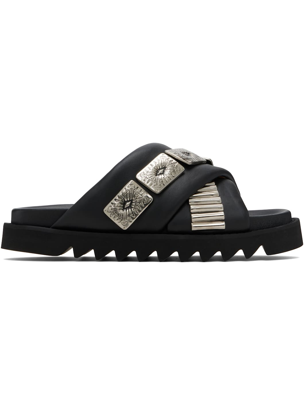 Padded buffed leather sandals. · Graphic hardware throughout · Open toe · Crisscrossing straps at vamp · Logo stamp at molded footbed · Foam rubber midsole · Treaded rubber sole Available exclusively at SSENSE. Supplier color: Black Upper: leather. Sole: rubber. Made in Portugal 252688M234002