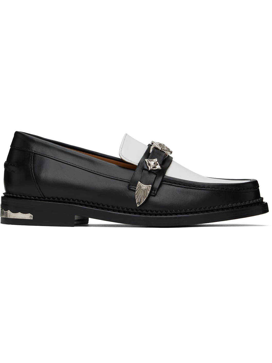 Buffed and polished leather loafers in black and white. · Moc toe · Strap at vamp · Signature graphic hardware at vamp and heel · Pinched seam at heel counter · Serrated detailing at welt · Suede and buffed leather lining · Stacked leather heel · Leather sole with rubber injection · Heel: H1" Available exclusively at SSENSE. Supplier color: Black/White Upper: leather. Sole: leather, rubber. Made in Portugal 251688M231023