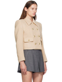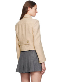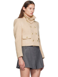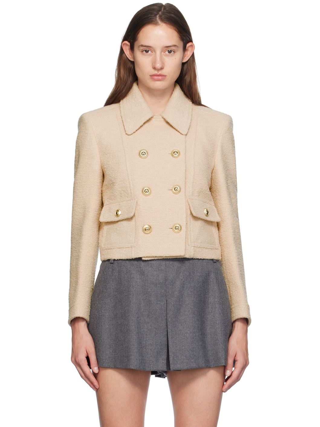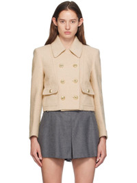 Boucle knit virgin wool-, silk-, and cashmere-blend jacket. · Spread collar · Detachable throat guard · Double-breasted button closure · Flap pockets · Padded shoulders · Single-button cuffs · Buttoned tab at back · Locker loop at inner collar · Full satin lining · Engraved pale gold-tone hardware Supplier color: Milky beige Body: 73% virgin wool, 10% polyamide, 8% silk, 7% cashmere, 2% elastane. Lining 1: 56% cotton, 44% viscose. Lining 2: 61% cupro, 39% viscose. Made in Italy 242076F063002