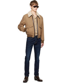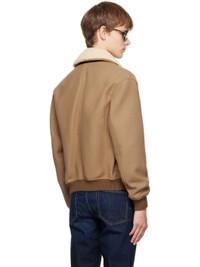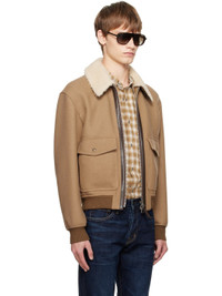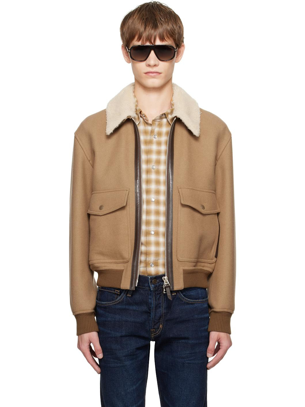 Wool melton bomber jacket. · Leather trim throughout · Detachable shearling trim at spread collar · Two-way zip closure · Flap and welt pockets at front · Rib-knit hem and cuffs · Button tab at back collar · Welt pocket at interior · Partial satin lining · Logo-engraved silver-tone hardware Supplier color: Camel Body: 100% wool. Trim 1: 90% cotton, 8% polyamide, 2% elastane. Trim 2: 100% calfskin. Trim 3: 100% lambskin. Lining: 56% cotton, 44% viscose. Made in Italy 252076M175001