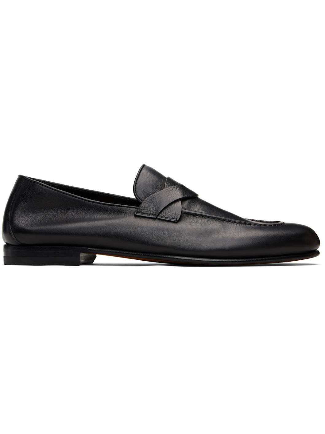 Grained leather loafers. · Moc toe · Crisscrossing straps at vamp · Stacked leather heel with rubber injection · Leather sole Supplier color: Black Upper: leather. Sole: leather, rubber. Made in Italy 252076M231001