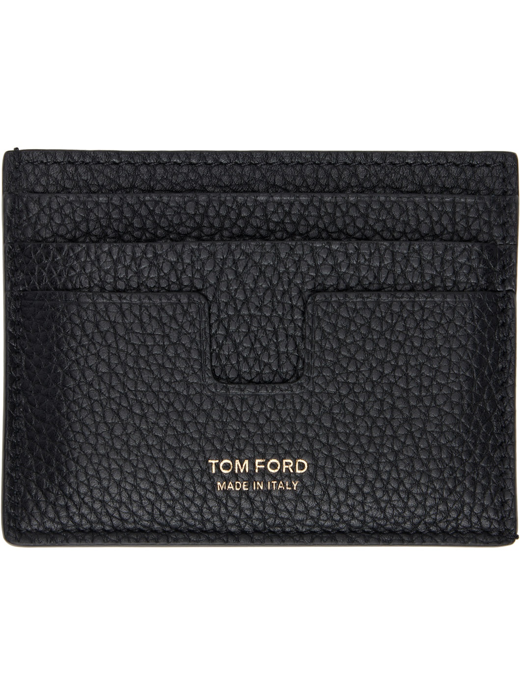 Pebble grained calfskin card holder in black. · Gold-tone logo stamp at face · Six card slots · Central note slot · Grained sheepskin lining · H3" x W4" Supplier color: Black Calfskin. Made in Italy 251076M163042