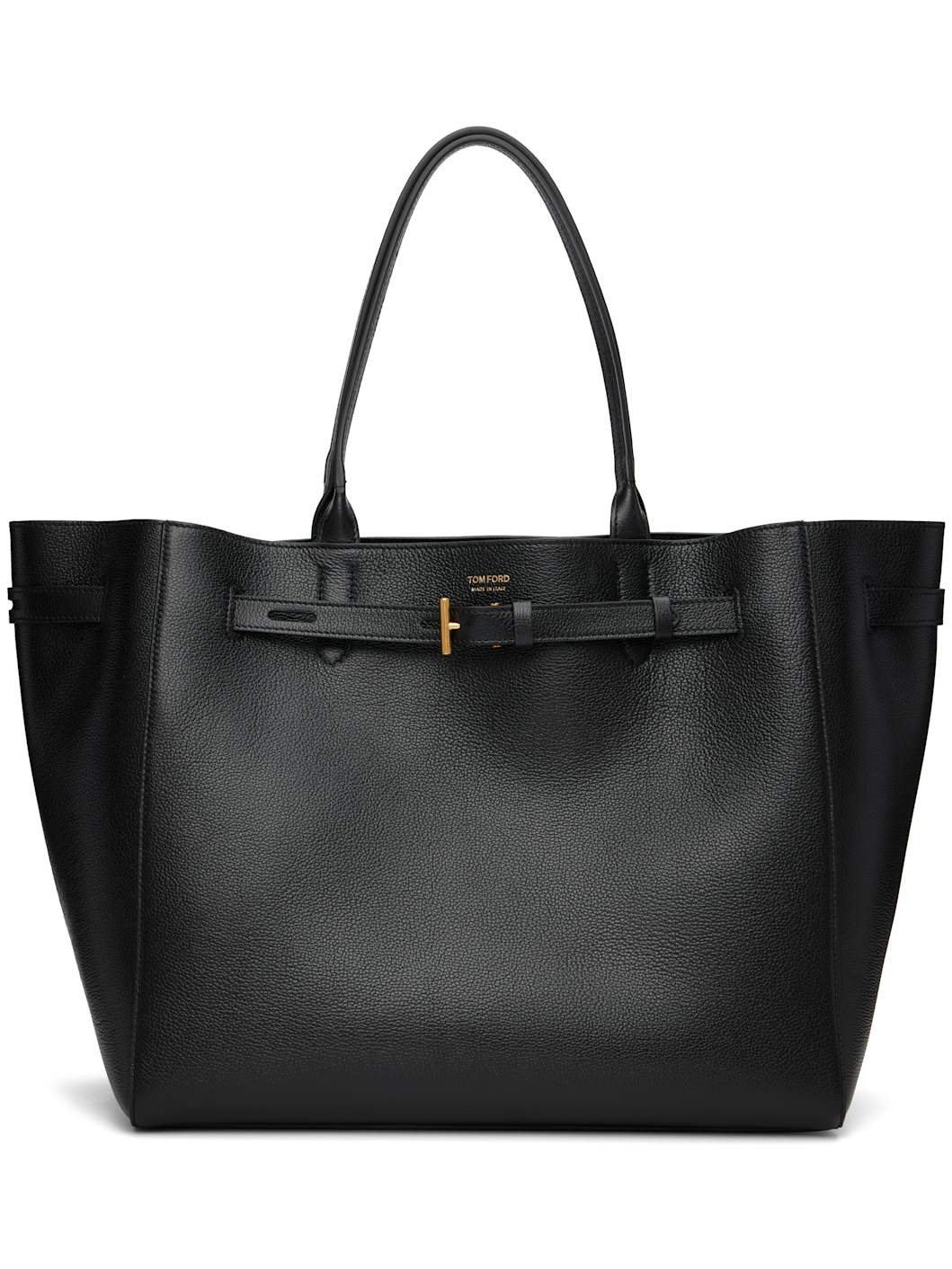 Pebble-grained calfskin carryall tote. · Fixed shoulder straps · Gold-tone logo stamp at face · Adjustable toggle strap · Zip pocket at suede interior · H12.25" x W14.5" x D6.25" Supplier color: Black Calfskin. Made in Italy 252076F049003