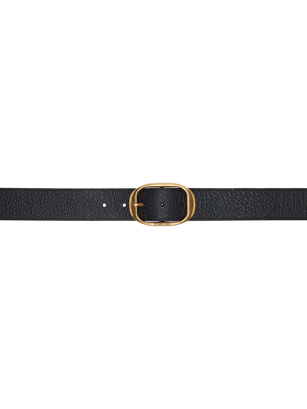 Pebble-grained calfskin belt in black. · Logo-engraved pin-buckle fastening · Gold-tone hardware · W1.5" Supplier color: Black Calfskin. Made in Italy 251076M131014