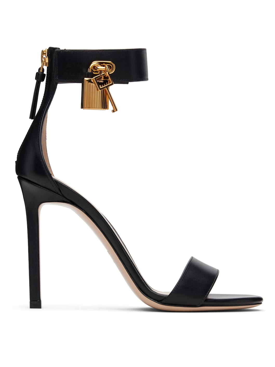 Buffed calfskin heeled sandals. · Open toe · Padlock and logo charm at fixed ankle strap · Zip closure at heel counter · Logo stamp at leather footbed · Stiletto heel with rubber injection · Polished leather sole · Logo-engraved gold-tone hardware · Heel: H4" Supplier color: Black Upper: calfskin. Sole: leather, rubber. Made in Italy 251076F125015
