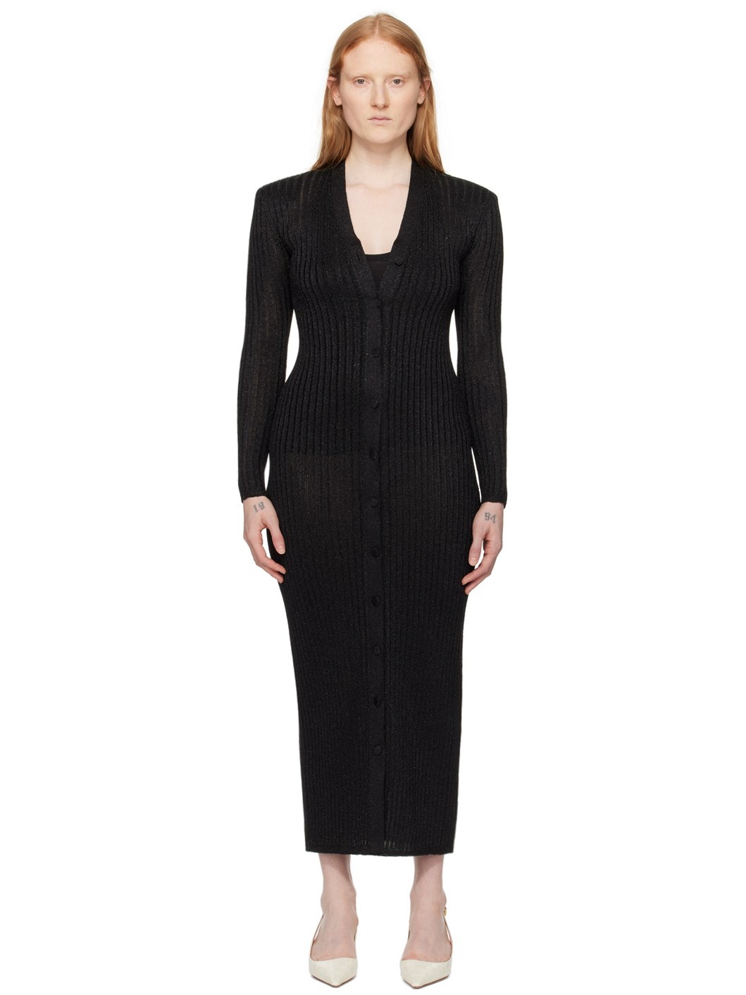 Semi-sheer rib knit polyester- and lurex-blend dress. · Y-neck · Button closure Supplier color: Black 66% polyester, 34% metallic polyester. Made in Italy 241076F054000