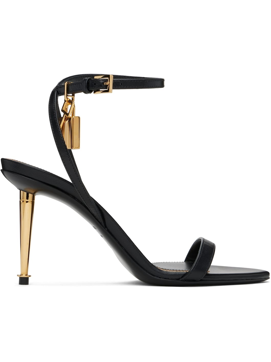 Buffed leather heeled sandals in black. · Open pointed toe · Strap at vamp · Padlock at adjustable pin-buckle ankle strap · Logo stamp at footbed · Metal stiletto heel with rubber injection · Polished leather sole · Heel: H4" Supplier color: Black Leather. Made in Italy 251076F125001