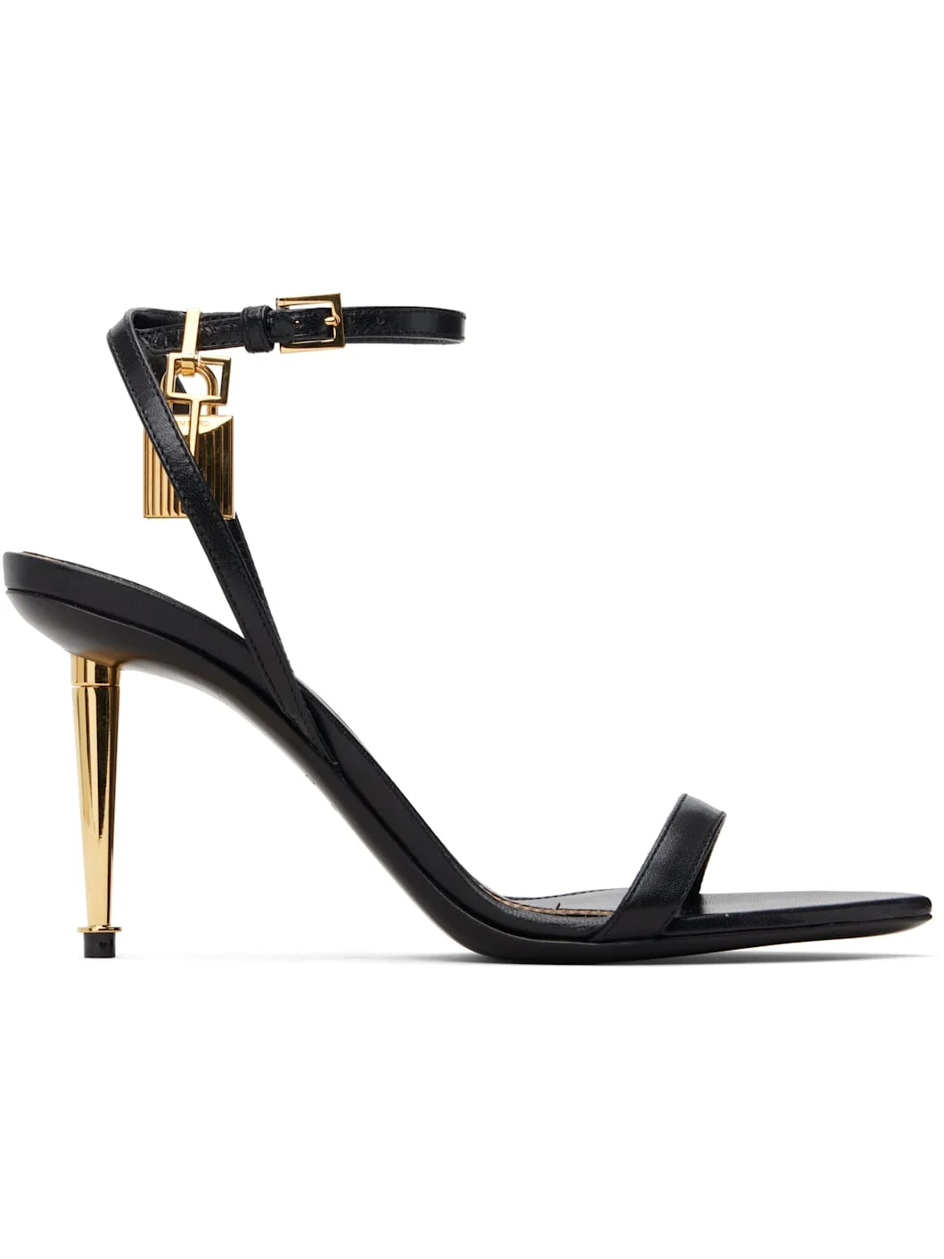 Buffed goatskin heeled sandals. · Open pointed toe · Padlock and key charm at pin-buckle ankle strap · Logo printed at leather footbed · Metal stiletto heel with rubber injection · Polished leather sole · Logo-engraved gold-tone hardware · Heel: H3" Supplier color: Black Upper: leather. Sole: leather. Made in Italy 261076F125006