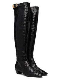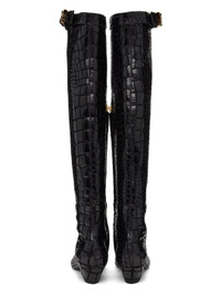 Knee-high goatskin suede boots in black. Croc pattern printed throughout. · Square toe · Cinch strap at collar · Zip closure at inner side · Grained leather lining in black · Covered block heel with rubber injection · Leather sole · Logo-engraved gold-tone hardware · Heel: H1.5 in Supplier color: Black