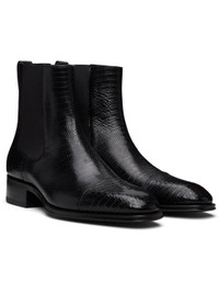 Croc-embossed calfskin Chelsea boots. · Cap toe · Elasticized gusset at sides · Pull-loop at heel collar · Buffed leather lining · Serrated detailing at welt · Stacked leather block heel with rubber injection · Leather sole · Heel: H1.5" Supplier color: Black Uppper: calfskin, textile. Sole: leather, rubber. Made in Italy 252076M223001