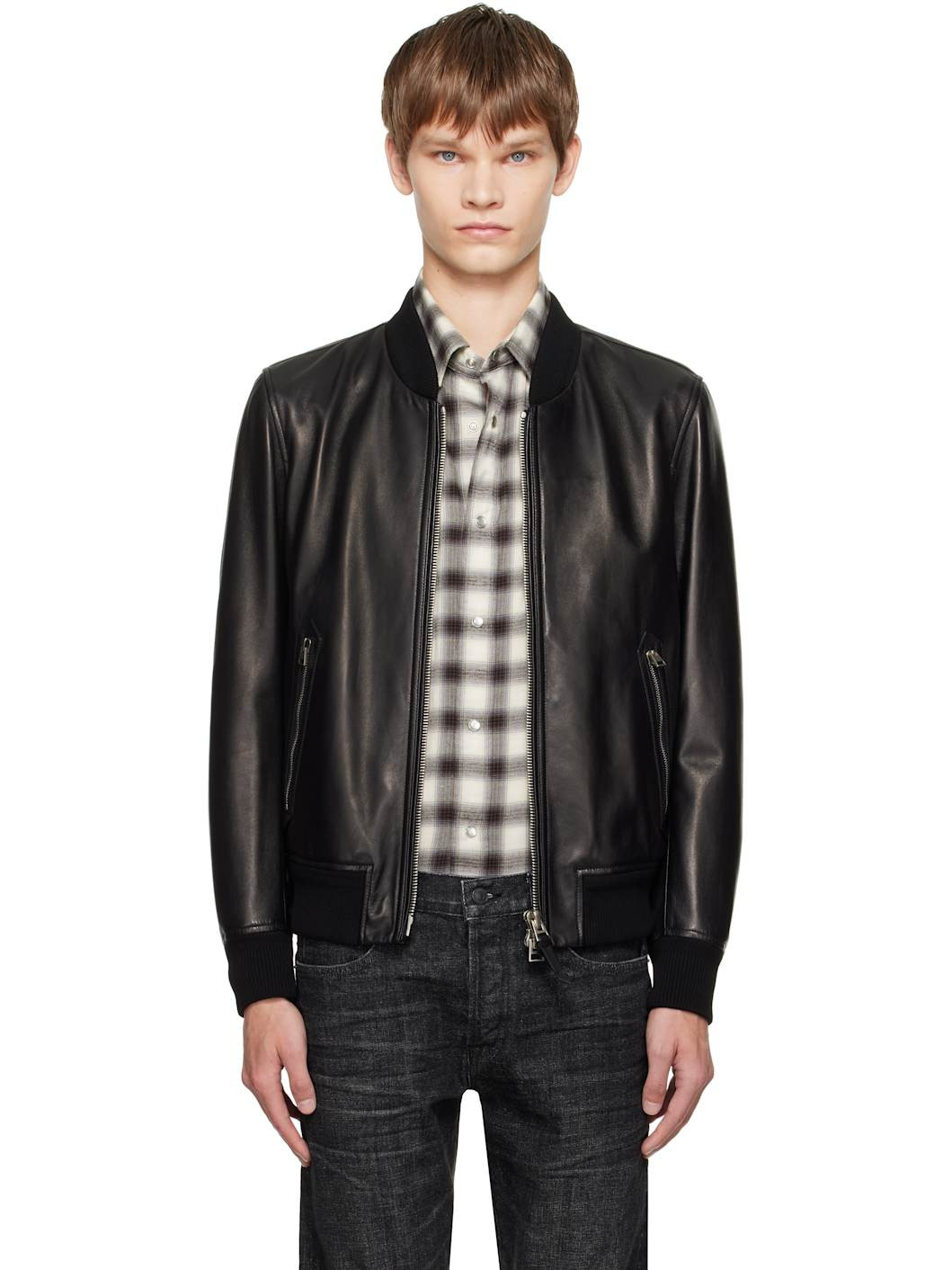 Grained lambskin jacket. · Rib-knit stand collar, hem, and cuffs · Two-way zip closure · Zip pockets at front · Welt pocket at interior · Fully lined · Logo-engraved silver-tone hardware Supplier color: Black Body: 100% lambskin. Trim: 90% cotton, 8% polyamide, 2% elastane. Lining 1: 56% cotton, 44% viscose. Lining 2: 61% cupro, 39% viscose. Made in Italy 252076M181002