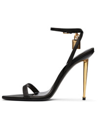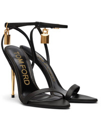 Buffed goatskin heeled sandals. · Open pointed toe · Padlock and logo charm at pin-buckle ankle strap · Logo printed at leather footbed · Metal stiletto heel with rubber injection · Polished leather sole · Logo-engraved gold-tone hardware · Heel: H4.25" Supplier color: Black Upper: goatskin. Sole: leather, rubber, metal. Made in Italy 252076F125005