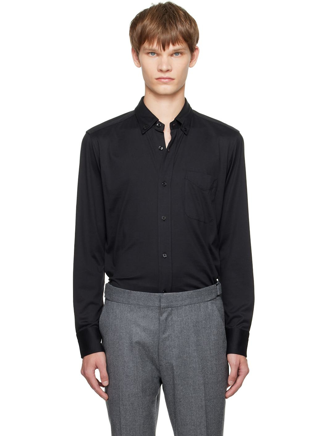 Silk- and cotton-blend jersey shirt. · Button-down spread collar · Button closure · Patch pocket at chest · Shirttail hem · Buttoned barrel cuffs · Box pleat at back yoke Supplier color: Black 60% silk, 40% cotton. Made in Portugal 252076M192012