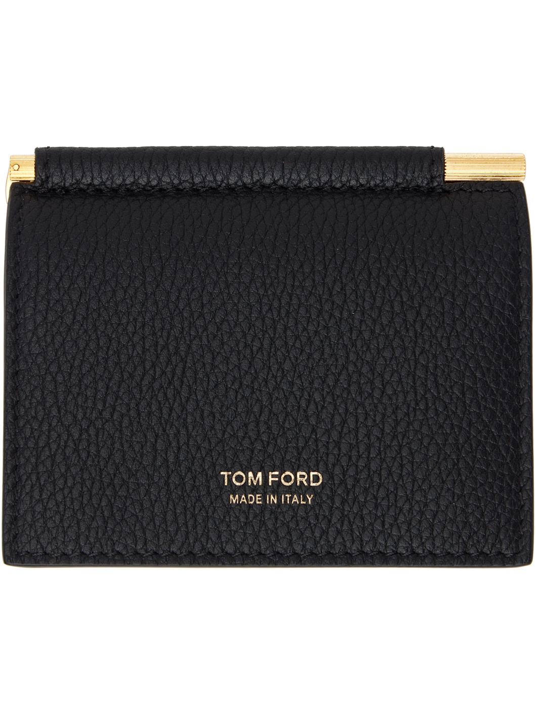 Pebble grained calfskin bifold card holder in black. · Logo stamp at face and interior · Patch pocket at back · Logo-engraved money clip at interior · Four card slots · Canvas lining · Gold-tone hardware · H4" x W3" Supplier color: Black Calfskin. Made in Italy 251076M163032