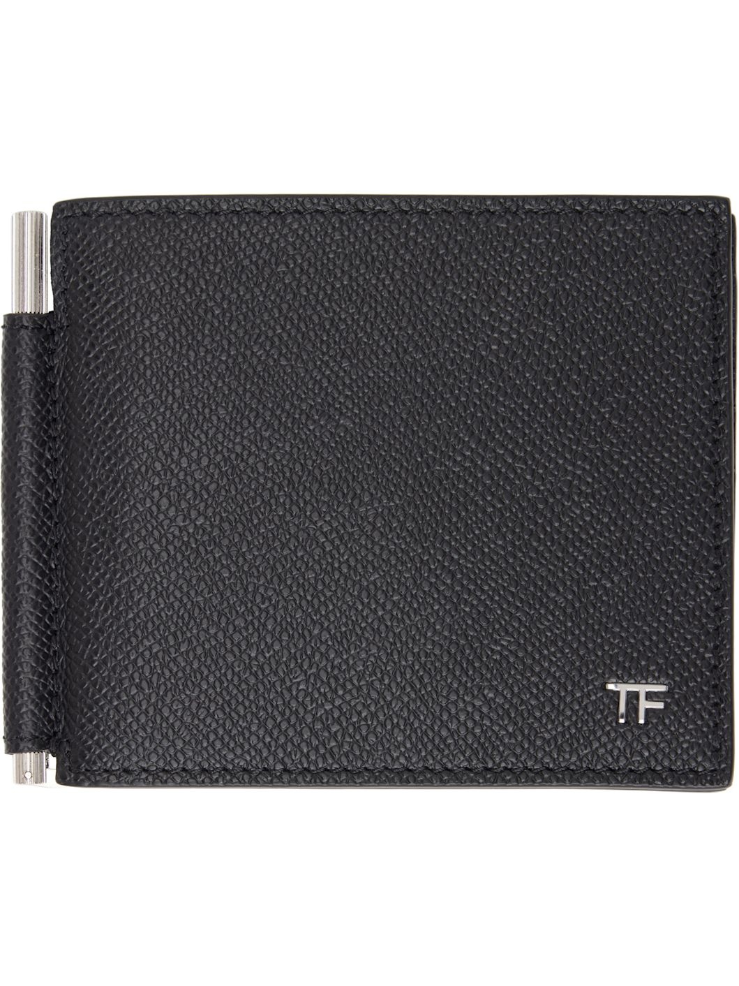 Pebble grained calfskin bifold wallet in black. · Inset logo hardware at face · Silver-tone logo stamp at interior · Logo-engraved money clip · Eight card slots · Grained sheepskin lining · Silver-tone hardware · H3.5" x W4" Supplier color: Black Body: 100% calfskin. Lining: 100% sheepskin. Made in Italy 251076M164010