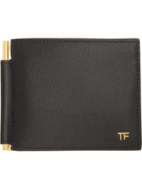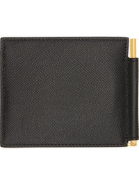 Grained calfskin bifold wallet. · Inset logo hardware at face · Logo-engraved money clip at interior · Eight card slots · Sheepskin interior · Gold-tone hardware · H3.75" x W4.5" x D1" Supplier color: Black Calfskin. Made in Italy 252076M164009