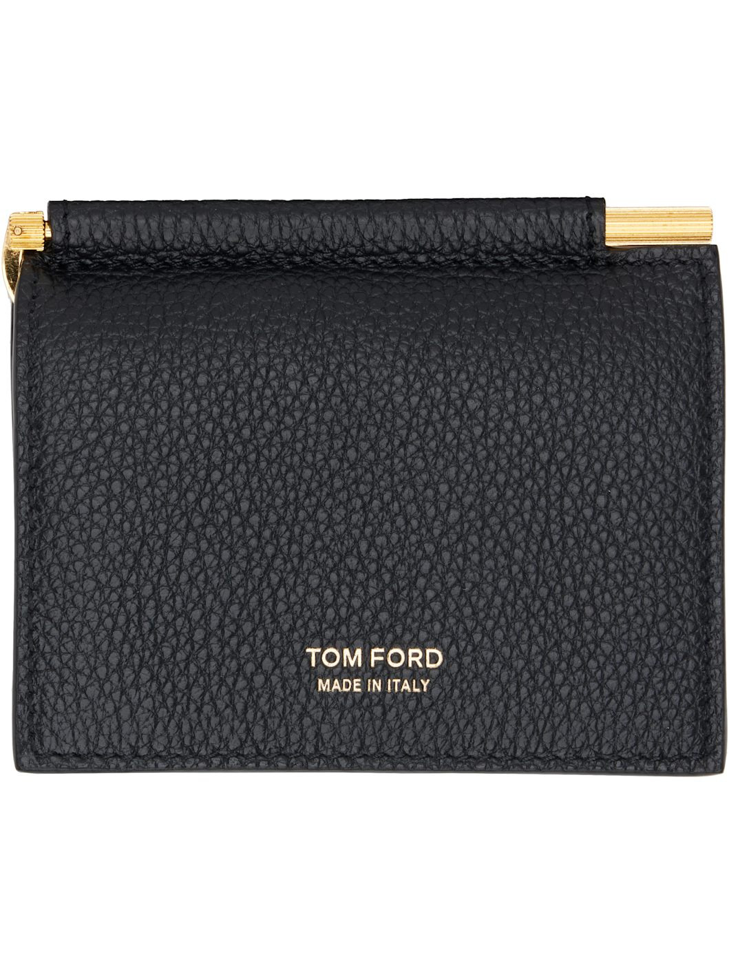 Pebble-grained calfskin card holder. · Gold-tone logo stamp at face · Card slot at back face · Four card slots and money clip at interior · Moire lining · Gold-tone hardware · H3.25" x W4" Supplier color: Black Calfskin. Made in Italy 252076M163016