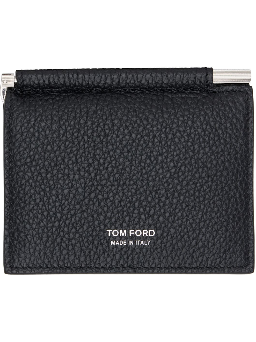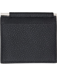Pebble-grained calfskin card holder. · Silver-tone logo stamp at face · Card slot at back face · Four card slots and money clip at interior · Moire lining · Silver-tone hardware · H3.25" x W4" Supplier color: Black Calfskin. Made in Italy 252076M163015