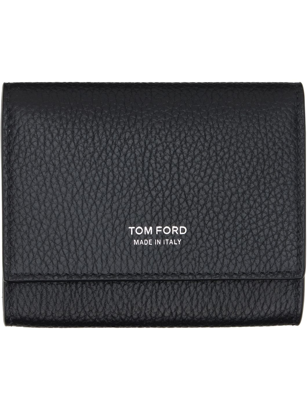 Pebble-grained calfskin card holder. · Silver-tone logo stamp at face · Press-stud flap · Two card slots and coin pouch at interior · Moire lining · H3.5" x W4" x D0.5" Supplier color: Black Calfskin. Made in Italy 252076M163005