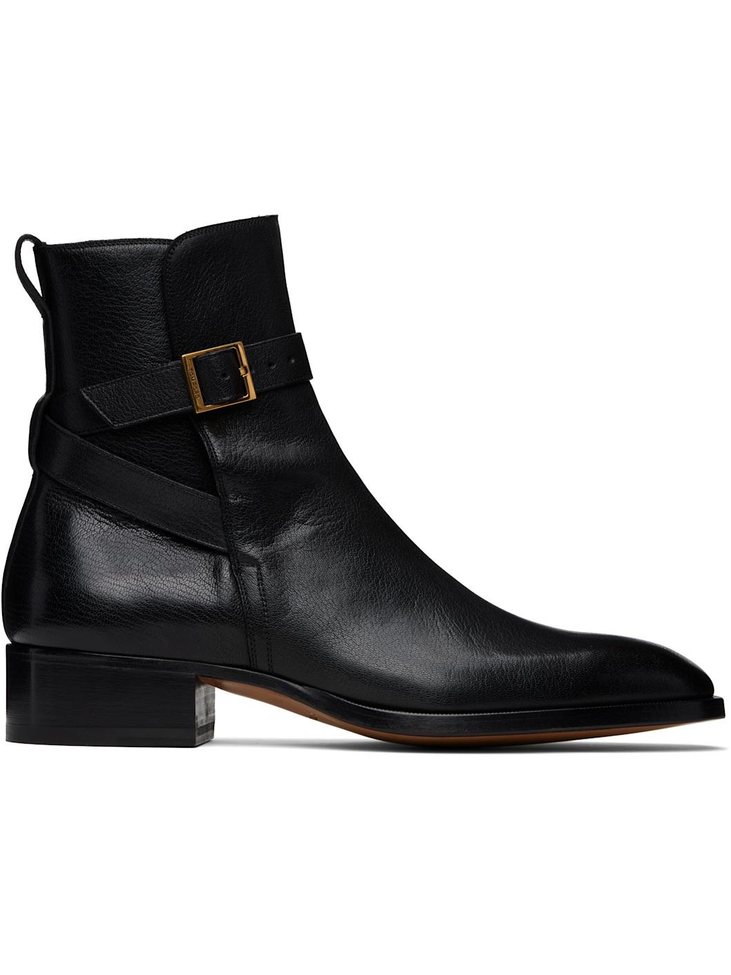 Ankle-high grained goatskin boots. · Square toe · Pin-buckle strap at vamp · Crisscrossing straps at sides · Pull-loop at heel collar · Buffed leather lining · Serrated detailing at welt · Stacked leather block heel with rubber injection · Leather sole · Logo-engraved gold-tone hardware · Heel: H1.5" Supplier color: Black Upper: goatskin. Sole: leather, rubber. Made in Italy 252076M228000