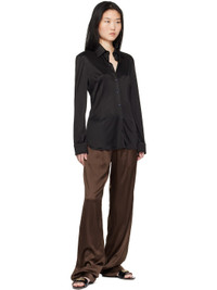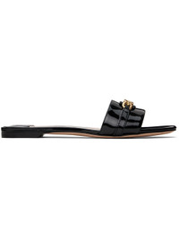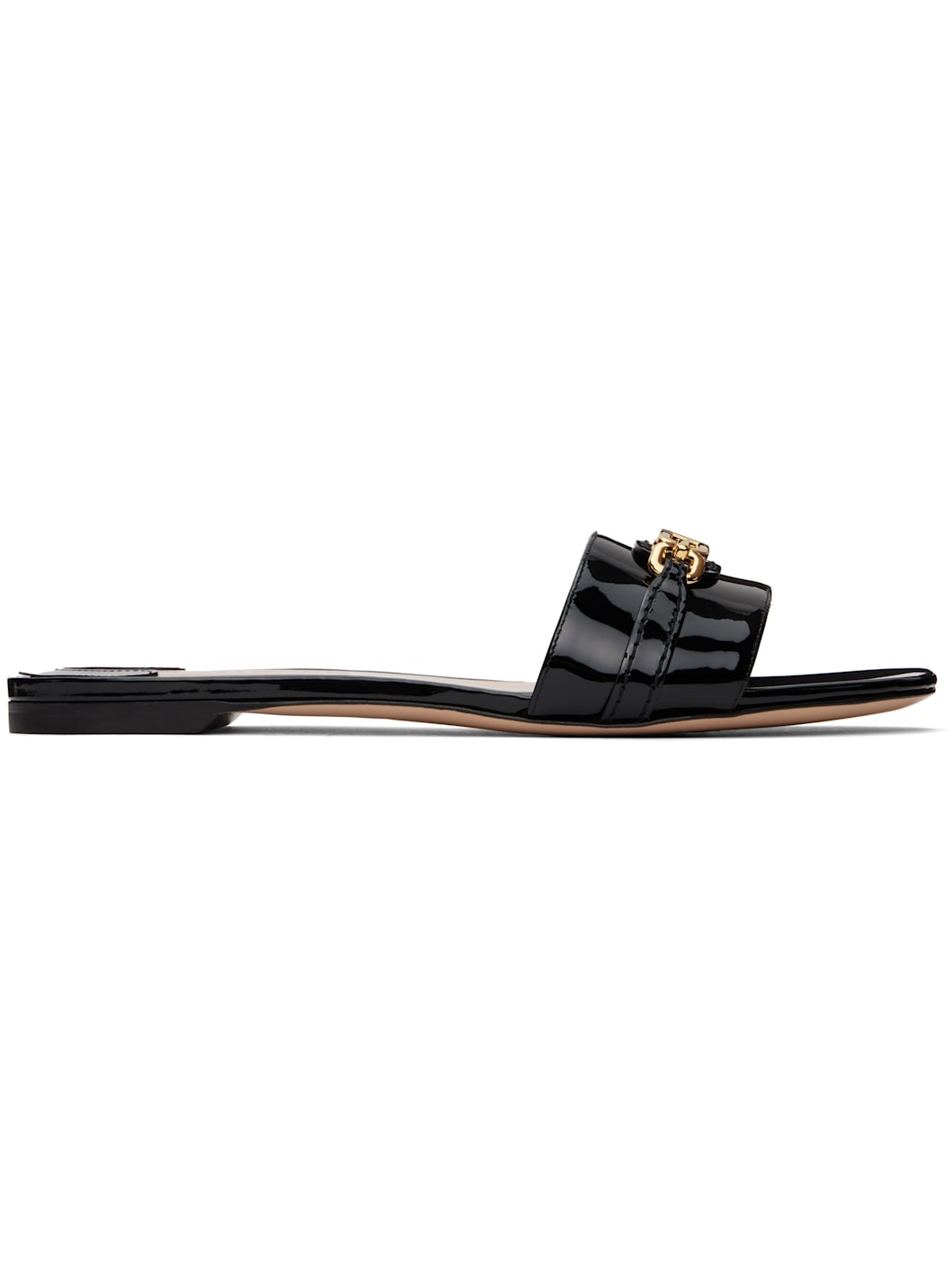 Patent calfskin flat sandals in black. · Open square toe · Logo hardware at vamp · Logo printed at padded footbed · Stacked leather heel with rubber injection · Leather sole Supplier color: Black Upper: calfskin. Sole: leather, rubber. Made in Italy 251076F124003