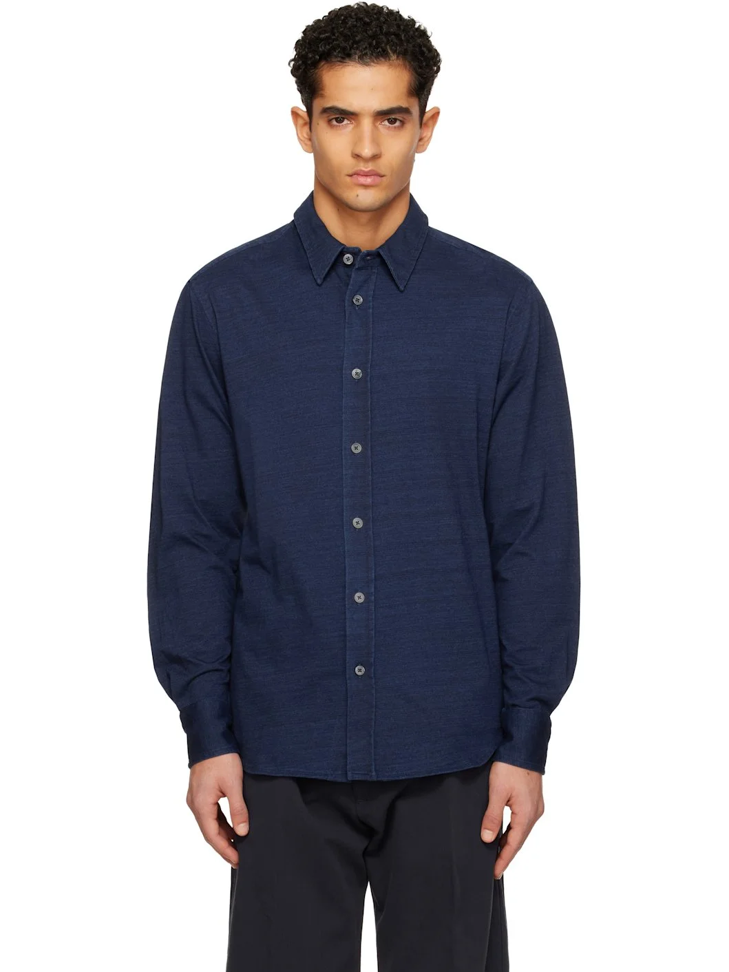 Cotton jersey shirt. · Spread collar · Button closure · Shirttail hem · Pleat at barrel cuffs · Box pleat at back yoke · Mother-of-pearl hardware Supplier color: Midnight blue 100% cotton. Made in Portugal 261076M192017