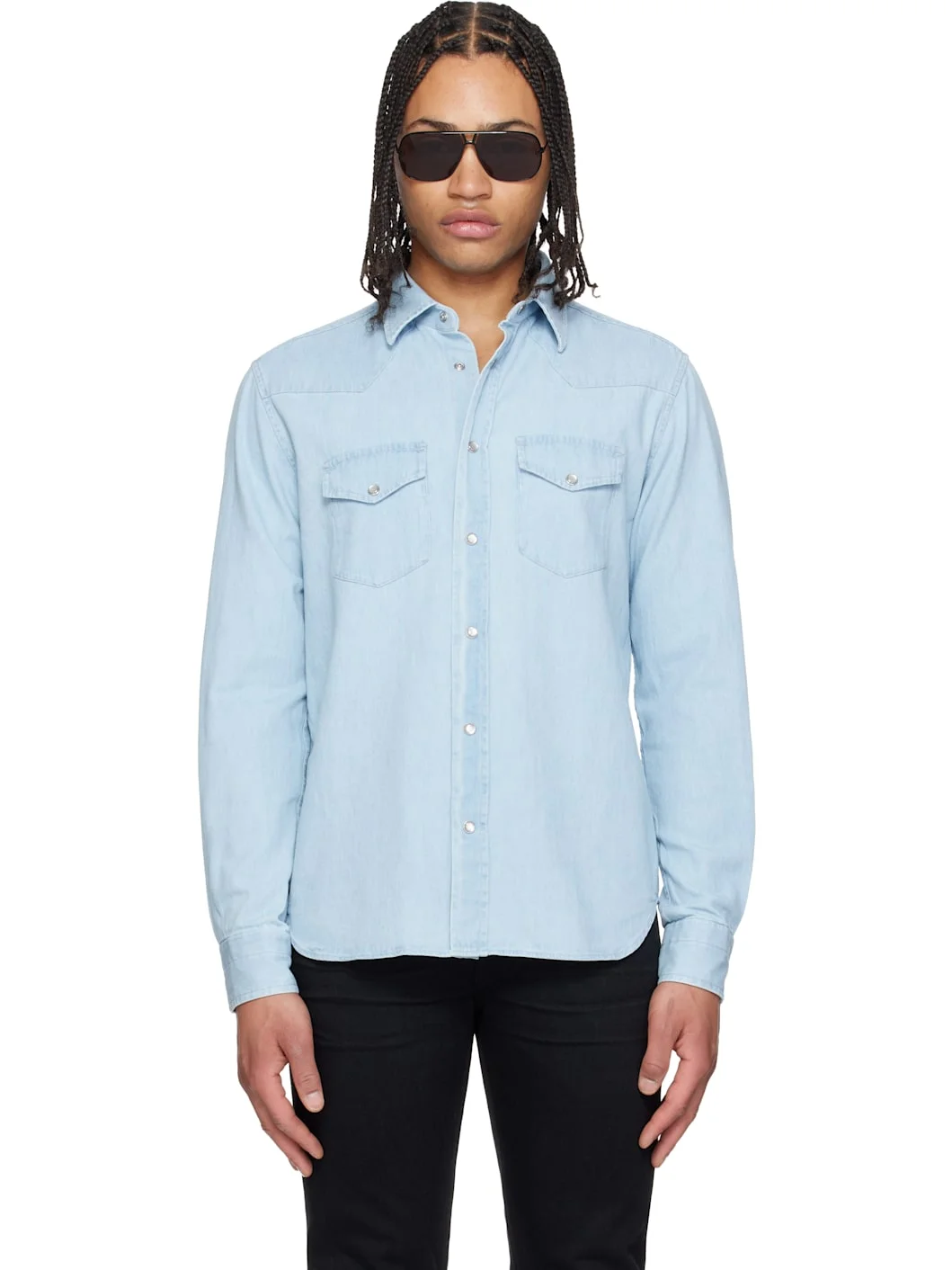 Non-stretch denim shirt. · Fading throughout · Spread collar · Press-stud closure · Western yoke · Flap pockets at chest · Shirttail hem · Buttoned barrel cuffs Supplier color: Pale blue denim 100% cotton. Made in Italy 261076M192022